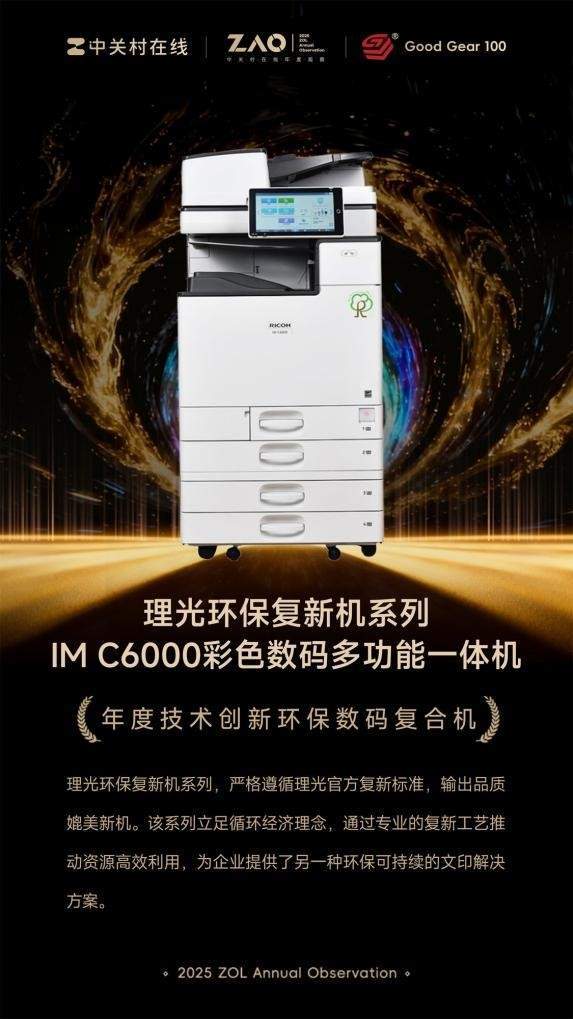 ZAO 2025中关村在线年度观察推选年度百大优秀产品奖项Good Gear 100,用以表彰年度科技行业标杆产品,代表着专业编辑、专业机构、领域达人和消费者的一致认可。理光环保复新机IM C6000系列凭借卓越的综合实力,以及环保理念,成功跻身这一榜单。