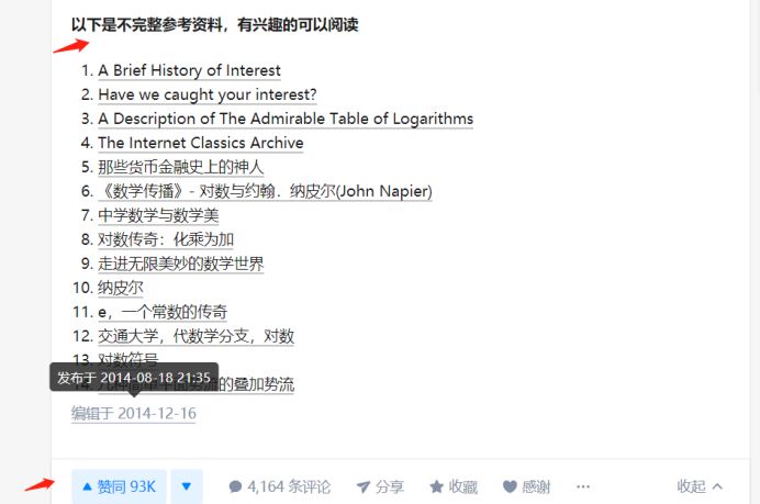 举个例子,以下这篇回答发布于2014年,题目是关于“数学里的 e 为什么叫做自然底数?”该回答由答主@张英锋 所撰写,全回答逾万字,该回答逻辑严谨,深入浅出,对人名和概念的引用也是随手拈来,并且在文末给出了详细的参考资料及出处,精英气质十足。